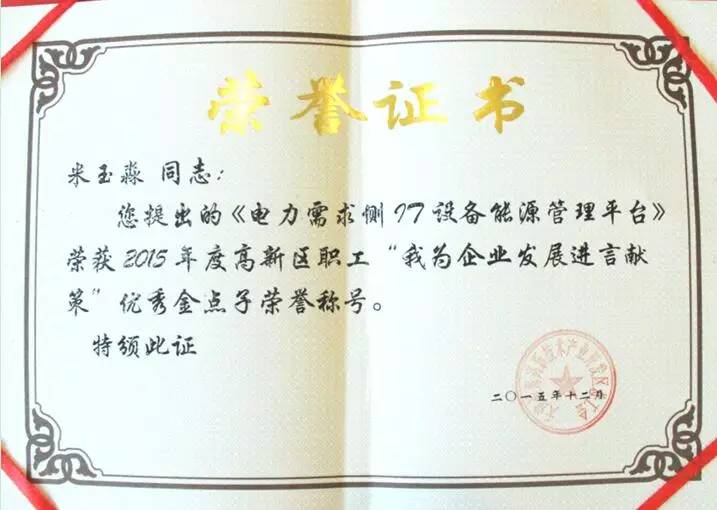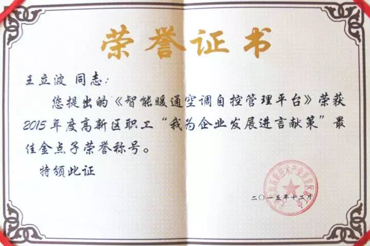 表彰大会上,BB贝博艾弗森电力副总经理覃岭从天津大学校领导张力新手中接过“优秀社会服务集体”的奖牌。这份荣誉不仅是天津大学对于BB贝博艾弗森电力优秀服务质量的高度肯定,更是集团在2015年继“滨海新区科学技术进步一等奖、天津市科学技术进步二等奖”之后收获的又一项殊荣。在BB贝博艾弗森的荣誉墙上,现已大大小小挂满了近二十种集团荣誉:最佳雇主奖、先进基层党组织、高新技术企业、天津市认定企业技术中心,天津市专利试点企业、院士专家工作站、天津大学电力新技术研究开发实验室、华北电力大学研究生工作站。BB贝博艾弗森与中科院、天津大学、华北电力大学等单位和高校开展产学研合作,并与倪光南院士成立了院士专家工作站,共同助力创新发展。更加值得欣喜的是,在年末之际,由海谐集团副总经理米玉淼和海谐集团创新中心副主任王立波分别提出的《电力需求侧IT设备能源管理平台》和《智能暖通空调自控管理平台》更是荣获了2015年度高新区职工“我为企业发展进言献策”最佳金点子荣誉称号。